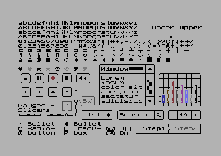 Ale dlaczego warto o niej wspomnieć? Przede wszystkim zestaw zawiera bardzo zgrabne czcionki. Litery i znaki są czytelne, przejrzyste i schludne. Występują w wersji normalnej i pogrubionej (bold). Najfajniejsze jest jednak to że autor pokusił się o zrobienie podstawowych elementów GUI. Przewidział wiele prostych gadgetów z których można ułożyć kompletne interfejsy w programach użytkowych albo w grach na C64. Mi po głowie chodzi użycie tego fonta np w … mojej nowej grze.